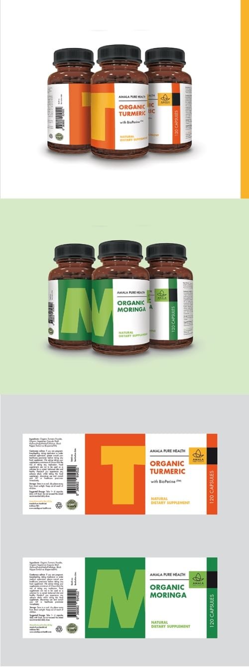 Disseny d’etiquetes per a la línia de suplements alimentaris naturals Organic Turmeric i Organic Moringa.