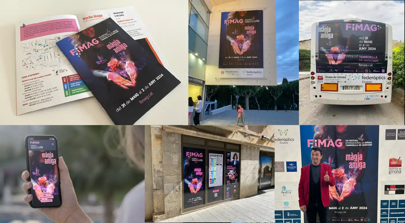 El cartell d’aquesta edició gira entorn del lema “màgia, amiga”, un joc visual i de significat que es llegeix igual en un sentit que en l’altre. Una paraula simètrica que simbolitza proximitat, complicitat i connexió amb el públic, i que reflecteix l’esperit acollidor del festival.