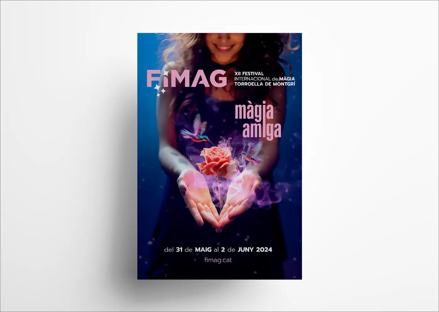 La imatge, amb mans que ofereixen una flor i colibrís envoltats de fum màgic, transmet delicadesa, sorpresa i bellesa, consolidant el FIMAG com un espai on la màgia es viu de manera propera i compartida.